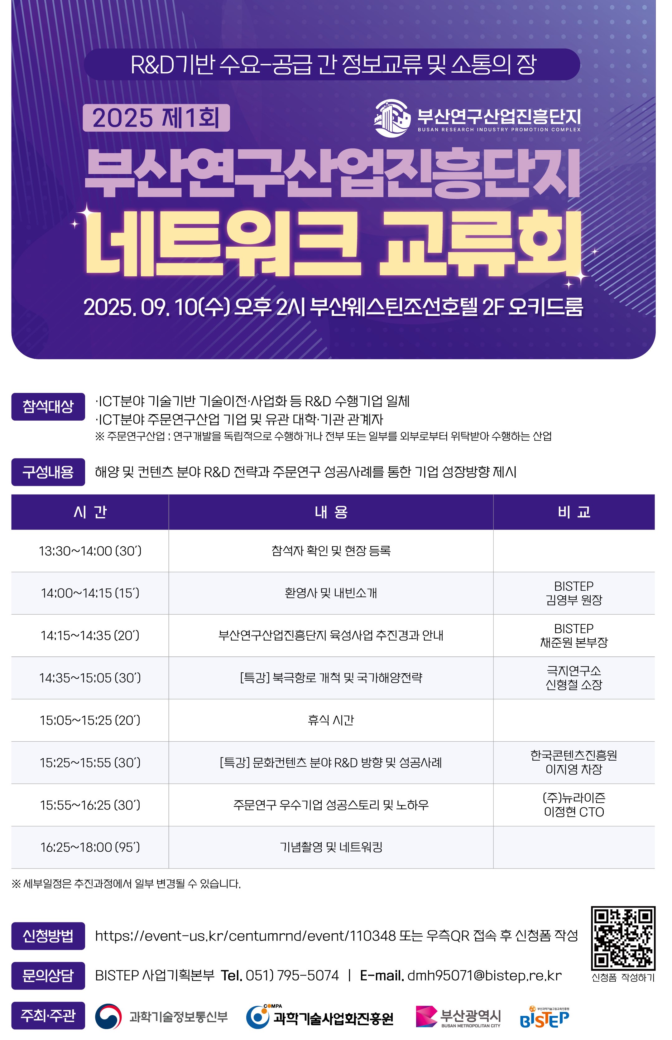 가. 명 칭: 2025년 제1회 부산연구산업진흥단지 네트워크 교류회 나. 일시장소: 2025. 9. 10.(수), 14:00~18:00 / 부산 웨스틴조선호텔 2f 오키드룸 다. 참석대상: 연구산업 관련 기업·기관·대학 및 연구산업에 관심있는 시민 라. 신청방법: https://event-us.kr/centumrnd/event/110348 접속 후 신청폼 작성 마. 구성내용
