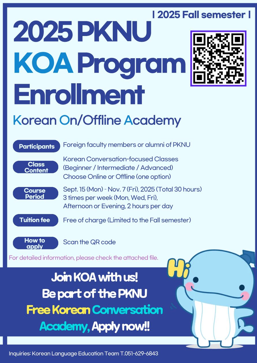 | 첨부파일 | 2025-Fall PKNU KOA Program 모집안내문.pdf 2025-Fall PKNU KOA Program 신청서(구글QR).hwp | ||||||||||||||